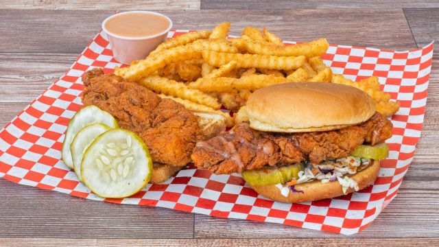 Seasoned fries with chopped chicken, Jojo sauce, pickles and Cole slaw.