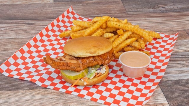 Seasoned fries with chopped chicken, Jojo sauce, pickles and Cole slaw.